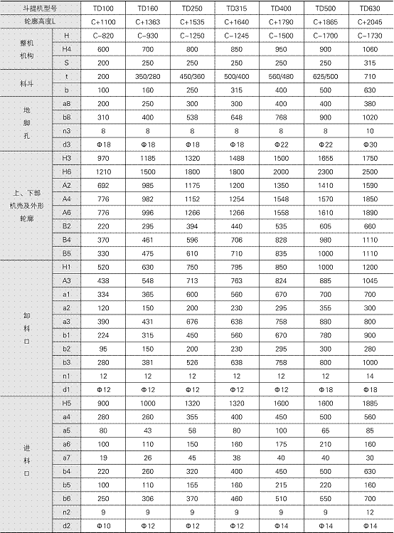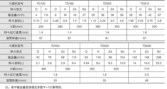 TD型斗提機(jī)備有四種料斗型式:Q型(淺斗)、H型(弧底斗)、Zd型(中深斗)、Sd型(深斗)。