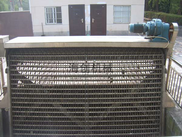 該設備采用回轉(zhuǎn)式,由一種特殊形狀的犁形耙齒按一定的裝配順序和數(shù)量排列在橫軸上,組成耙齒 鏈,根據(jù)過水流量,裝配成不同的間隙,安裝在泵站或水處理系統(tǒng)的入口處,當驅(qū)動裝置帶動耙齒鏈自下向上運動時,水中的雜物被耙齒鏈撈起,液體則在柵隙中流過,設備轉(zhuǎn)動到上部頂點后,耙齒鏈改變運行方向,由上向下運動,物料依靠自重從耙齒上自行脫落,當耙齒從反面轉(zhuǎn)到設備底部時,又開始另一循環(huán)往復的連續(xù)運行,從而不斷的從水中清撈雜物,達到固液分離的目的。