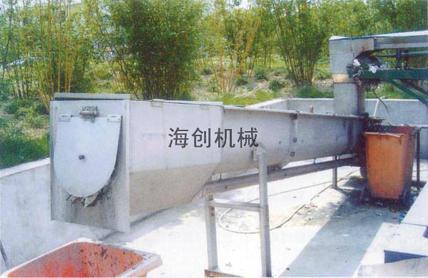 該設(shè)備采用無軸螺旋式,當(dāng)物料從輸送壓榨機(jī)的進(jìn)料斗進(jìn)入,依靠螺旋葉片的旋轉(zhuǎn)將物料推移滑行,沿U型輸送槽送至壓實(shí)區(qū),在壓榨管及出料門蓋的反彈簧壓力下,使柵渣壓榨脫水,脫水后的柵渣強(qiáng)制打開壓力板落至垃圾小車內(nèi)外運(yùn),擠壓的滲水則通過回水管路流入格柵井中。