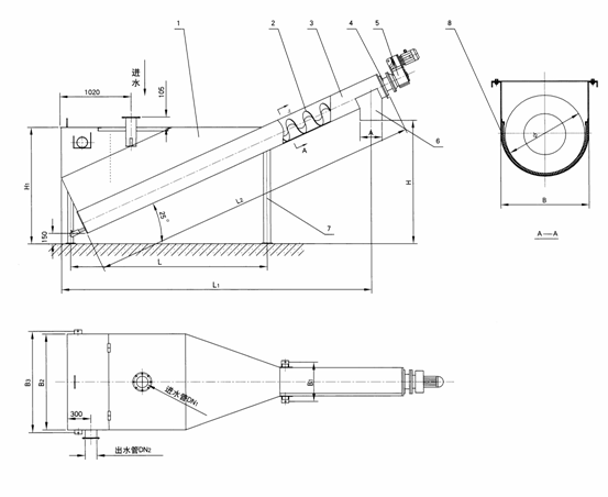 1、分離槽 2、螺旋葉片 3、U型槽 4、軸承座 5、驅(qū)動裝置 6、排砂口 7、支架 8、耐磨襯墊