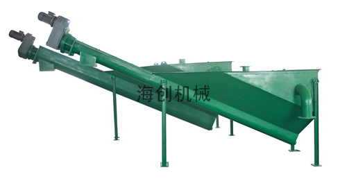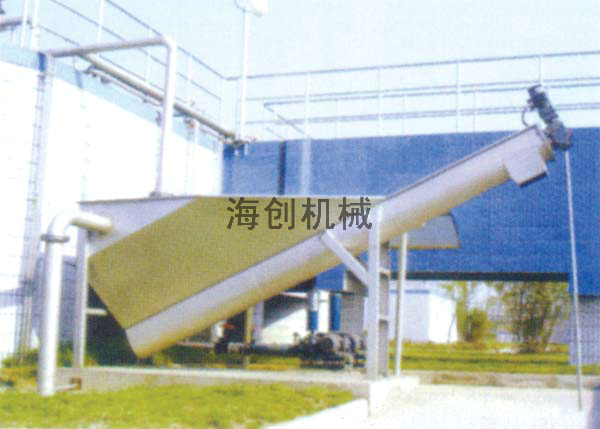 該設(shè)備采用無軸螺旋式,砂水混合液從分離器上部輸入,砂礫在砂水分離槽內(nèi)靠重力沉降,并利用無軸螺旋體的旋轉(zhuǎn),將砂礫沿25°的U型槽逐漸推至出口處,落入接料筒后外運,分離水則從分離槽溢流口排出,以改善操作環(huán)境和利于外運。